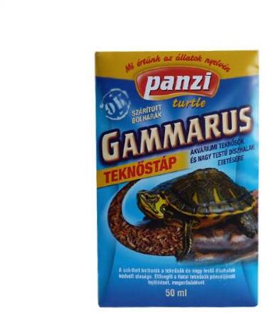 PANZI Gammarus szárított bolharák Akváriumi teknősöknek — Teknőstáp akváriumi teknősök és nagytestű díszhalak etetéséreA gammarus szárított rák a teknősök é s a nagytestű díszhalak kedvelt elesége. Elősegíti a fiatal teknősök páncéljának fejlődését, megerősödését. Teljesértékű táp, főeleségként adható. Beltartalom:állati fehérje, nedvességtartalom 13%Összetétel:napon szárított gammarusAdagolás: Amennyit a teknősök 2-3 percen belül elfgyasztanak. Ügyeljünk, hogy ne etessük túl a teknősöket, mivel az eledel bomlásnak indul a vízben. Kiszerelés: 50ml