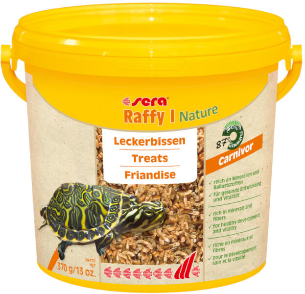 A zooplus. hu kínálatából: A Sera Raffy I. teknőstáppal a vízi teknősök, a szárazföldi teknősök és nyakörvösgyíkfélék ízletes, fajnak megfelelő táplálékot kapnak. Megfelelő változatosságot biztosít, mivel magas arányban tartalmaz Gammarust. . A táplálék összetétele fontos fehérjéket, omega zsírsavakat, értékes kartinoidokat, ásványi anyagokat és nyomelemeket biztosít a teknősök számára. A rostok támogatják a természetes emésztést. Ez a természetes eledel továbbá mentes a színezékektől és tartósítószerektől, valamint kíméletesen szárítják, így megőrizve a tápanyagokat. A Sera Raffy I Gammarusmix jellemzői: Vegyes eledel teknősök számára Sok Gammarus rákkal: sok fehérjével Fehérjében, omega zsírsavakban, ásványi anyagokban és nyomelemekben gazdag Kiváló minőségű élelmi rostokkal: támogatja a természetes emésztést Színezékektől és tartósítószerektől mentes